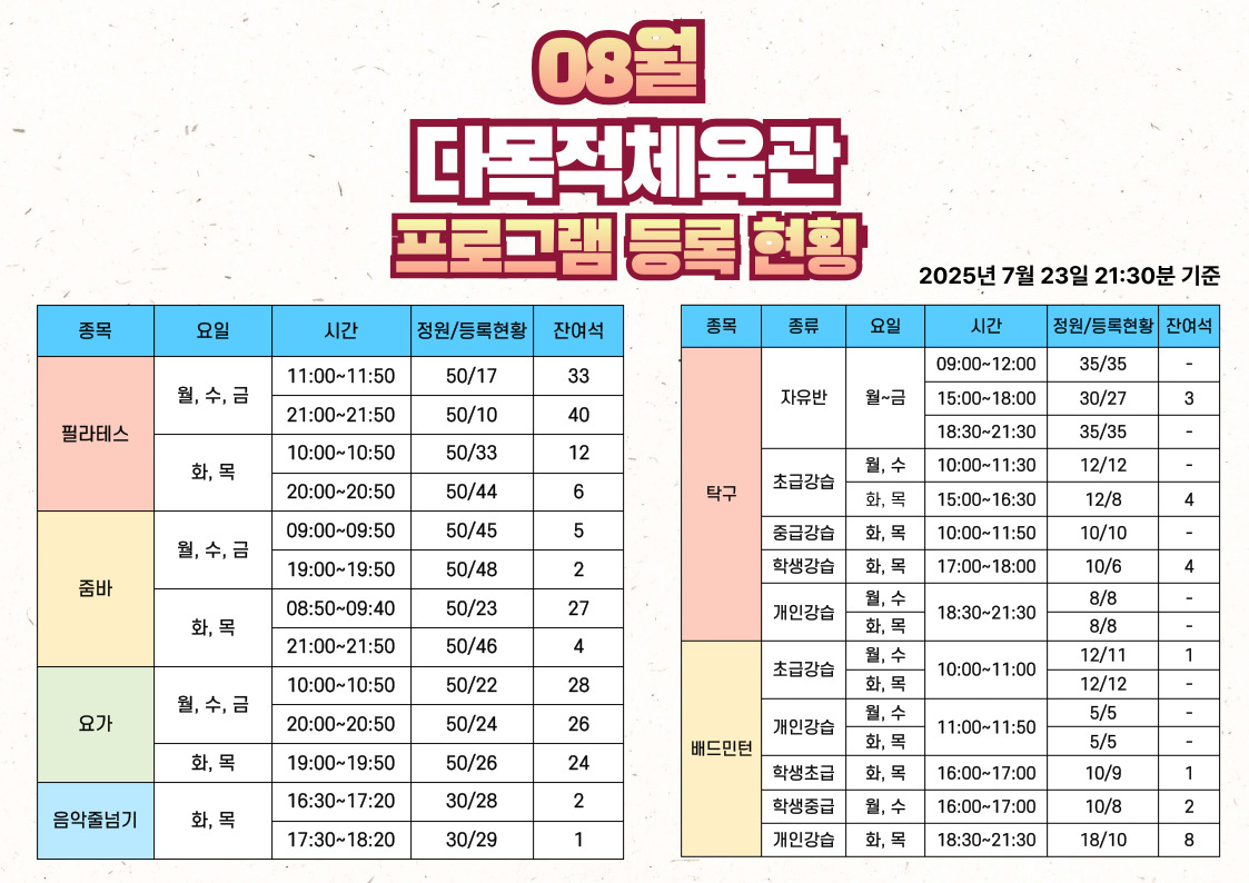 2025년 8월 달구벌스포츠클럽 프로그램 등록현황(7월 23일 21:30분 기준)