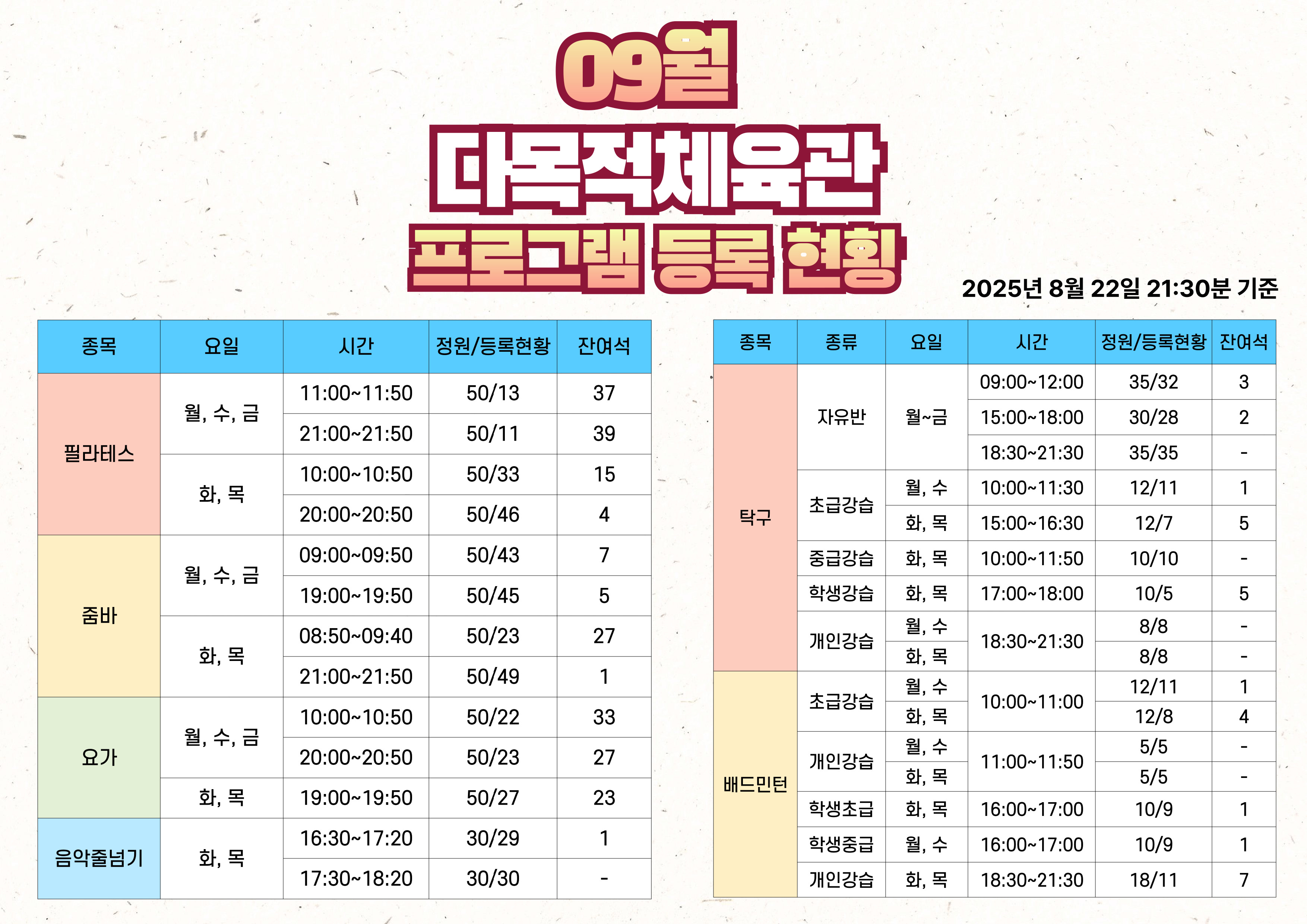 2025년 9월 달구벌스포츠클럽 프로그램 등록현황(8월 22일 21:30분 기준)