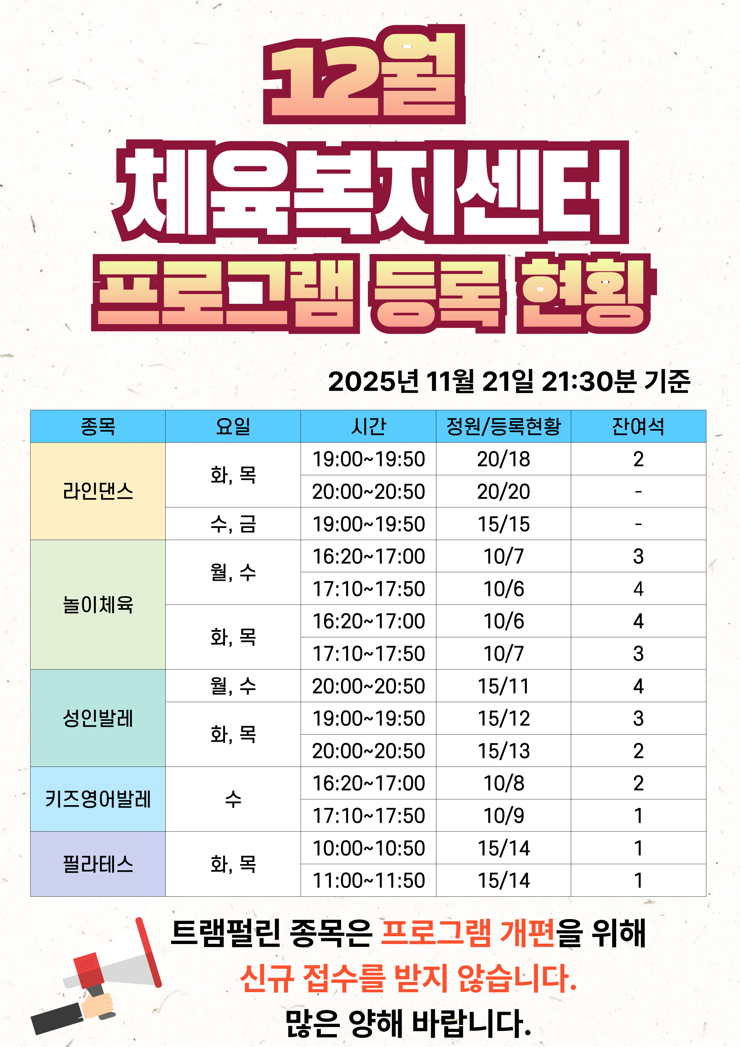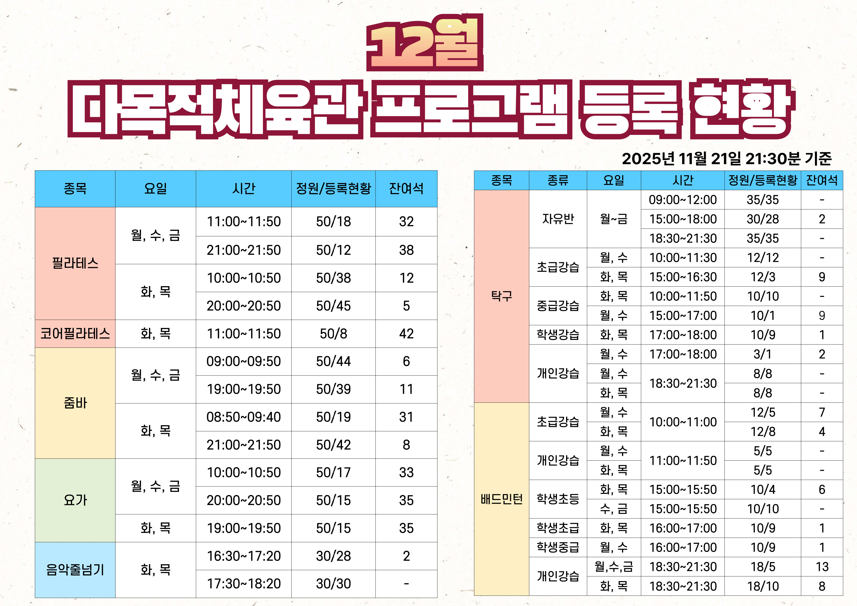 2025년 12월 달구벌스포츠클럽 프로그램 등록현황(11월 21일 21:30분 기준)
