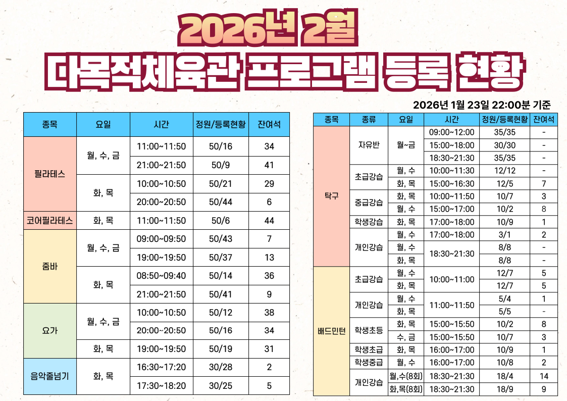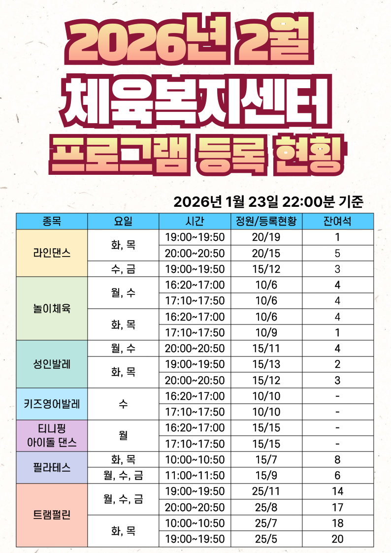 2026년 2월 달구벌스포츠클럽 프로그램 등록현황(1월 23일 22:00분 기준)