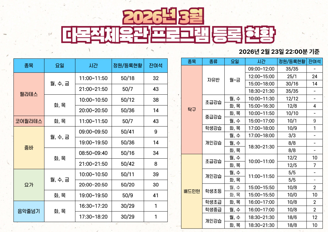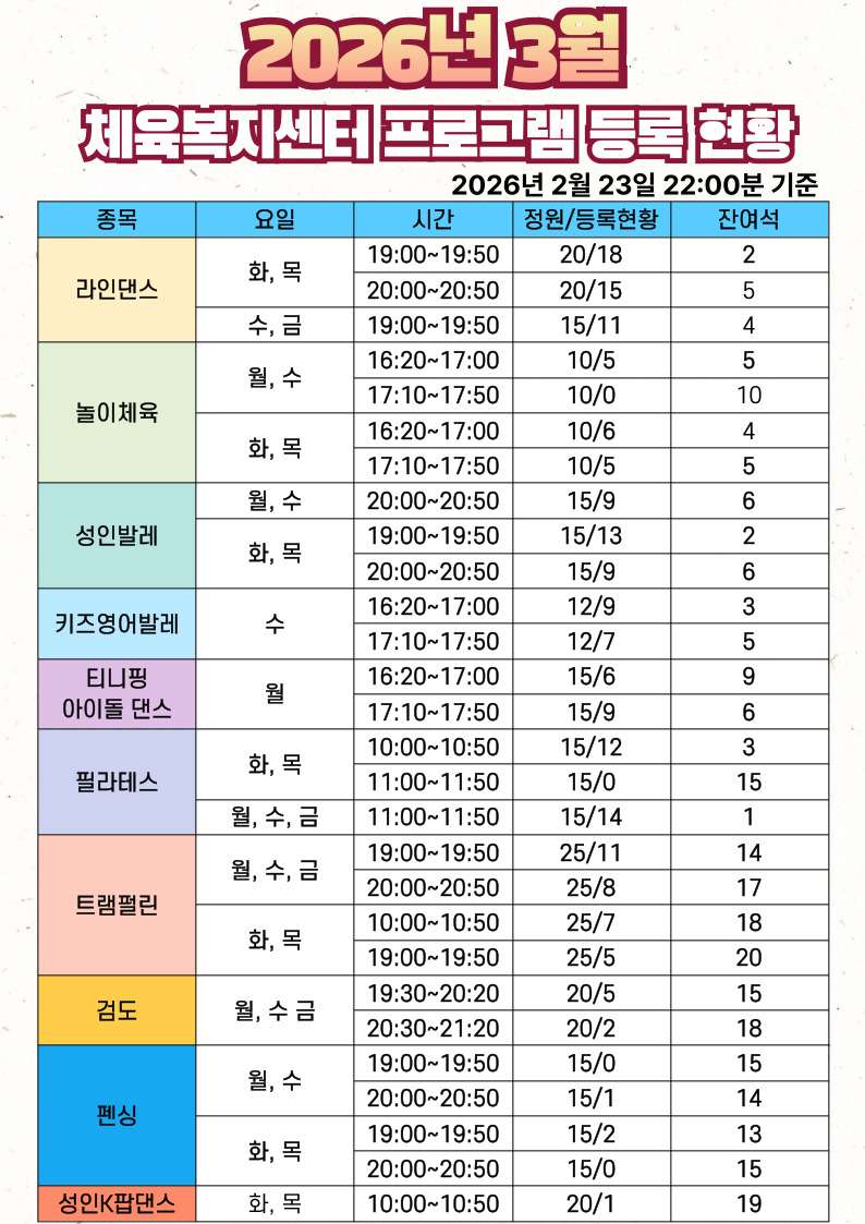 2026년 3월 달구벌스포츠클럽 프로그램 등록현황(2월 23일 22:00분 기준)