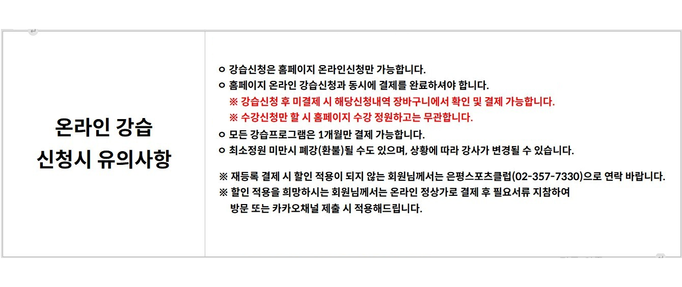추가 등록 | 매월 28일 10시 ~ 말일 17시 까지 추첨시행일 및 추가등록 시작일이 주말 및 공휴일인 경우 다음날 평일에 진행 | - 모든 종목 프로그램 지역 상관없이 선착순 온라인 접수 및 결제 | - 자세한 사항 “홈페이지 클럽일정” 참고 |