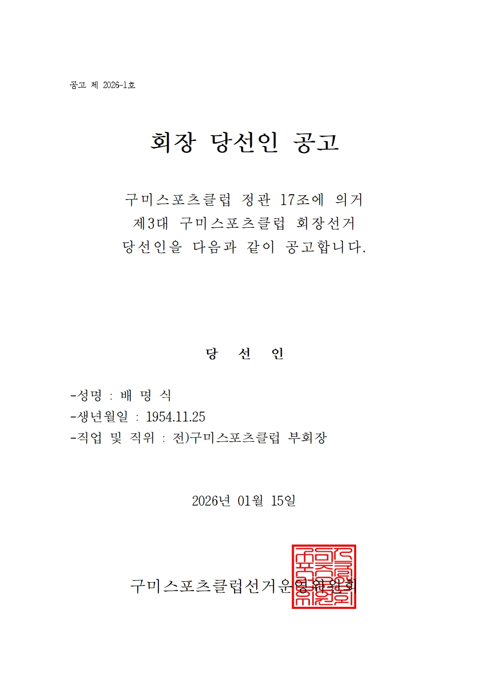 다음과 같이 구미스포츠클럽 회장 당선인을 공고합니다.