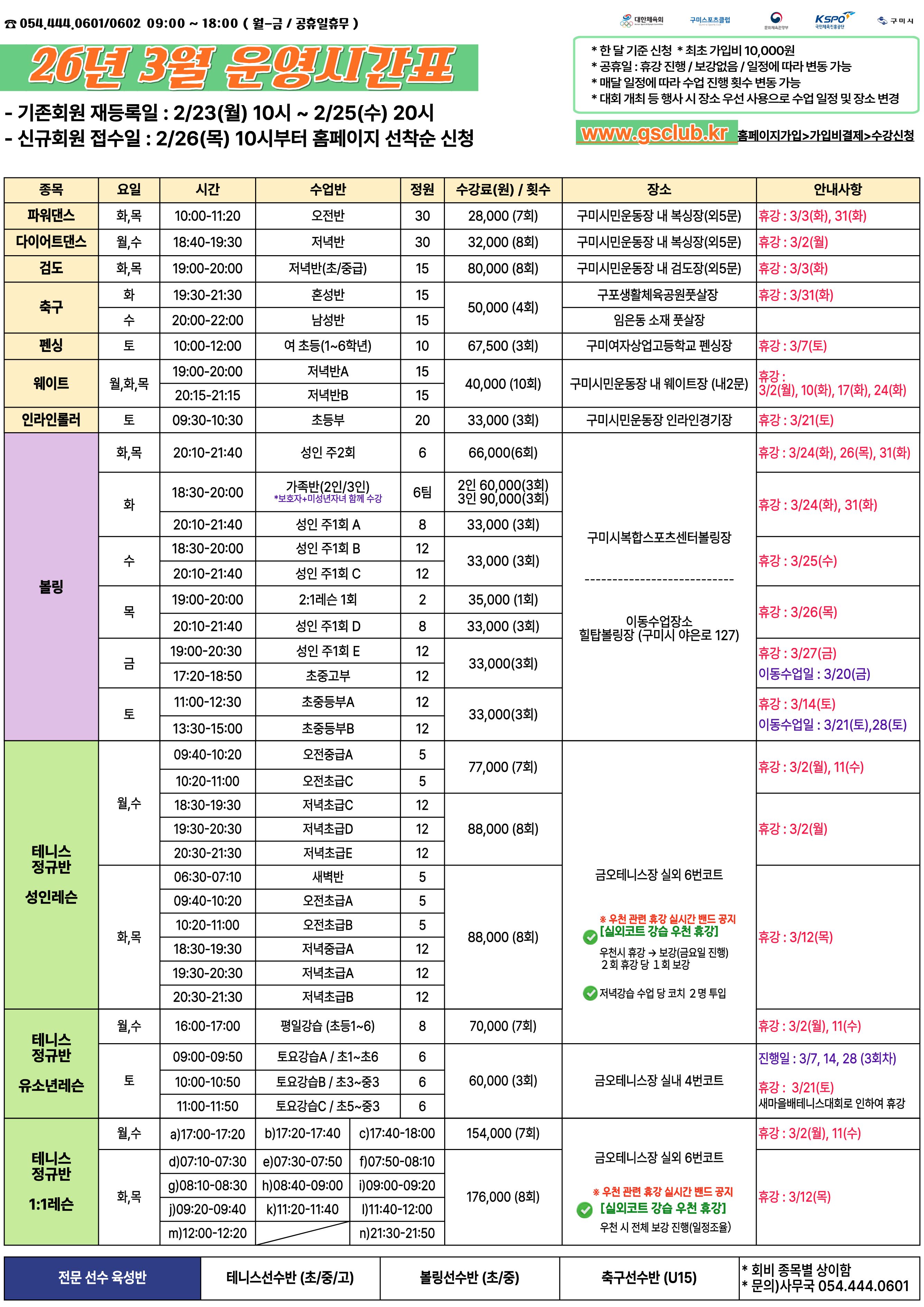 구미스포츠클럽 2026년 3월 운영시간표 안내