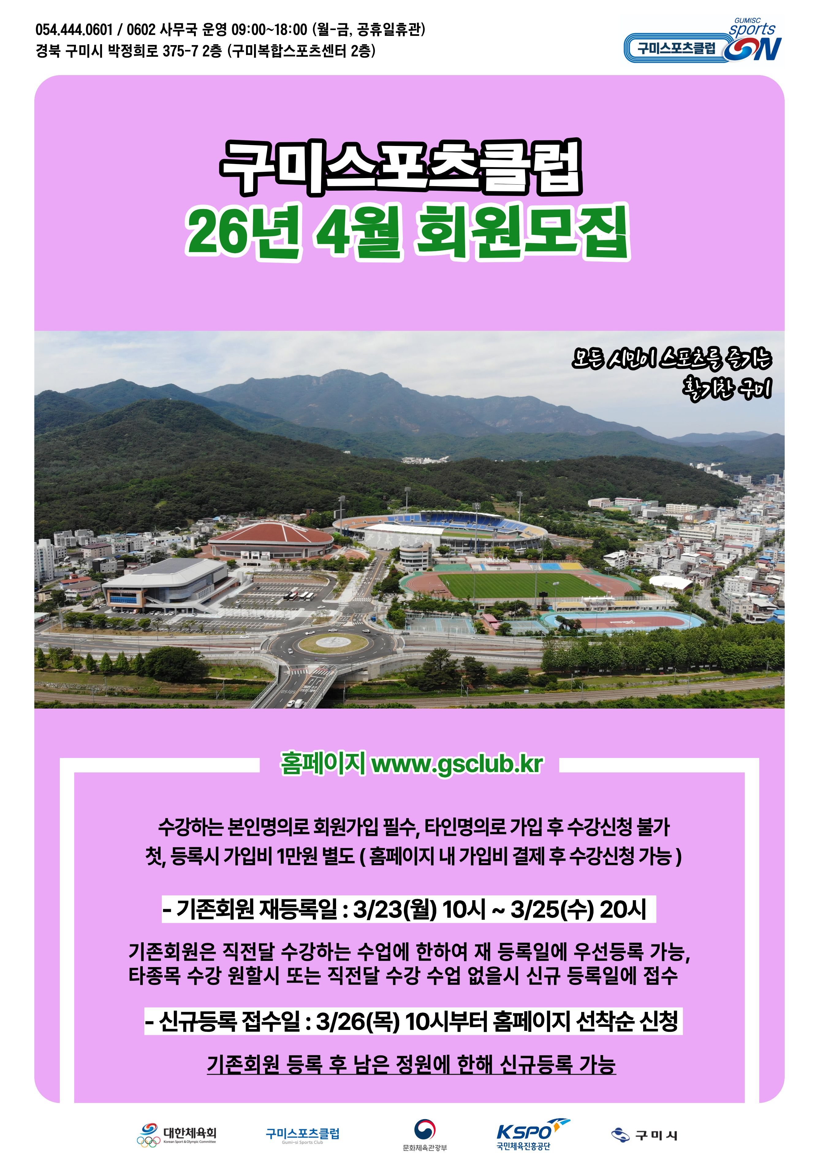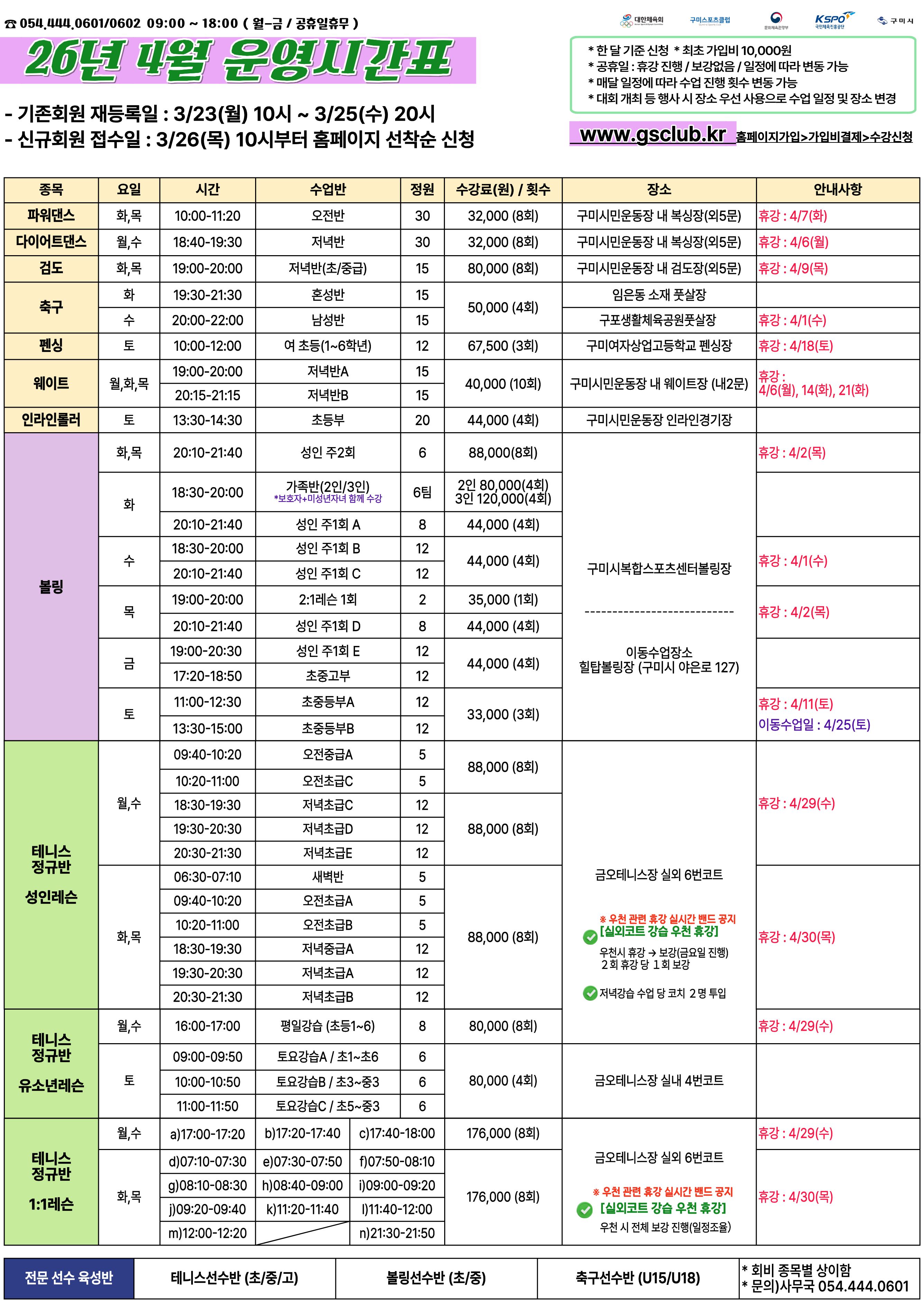 구미스포츠클럽 2026년 4월 운영시간표 안내