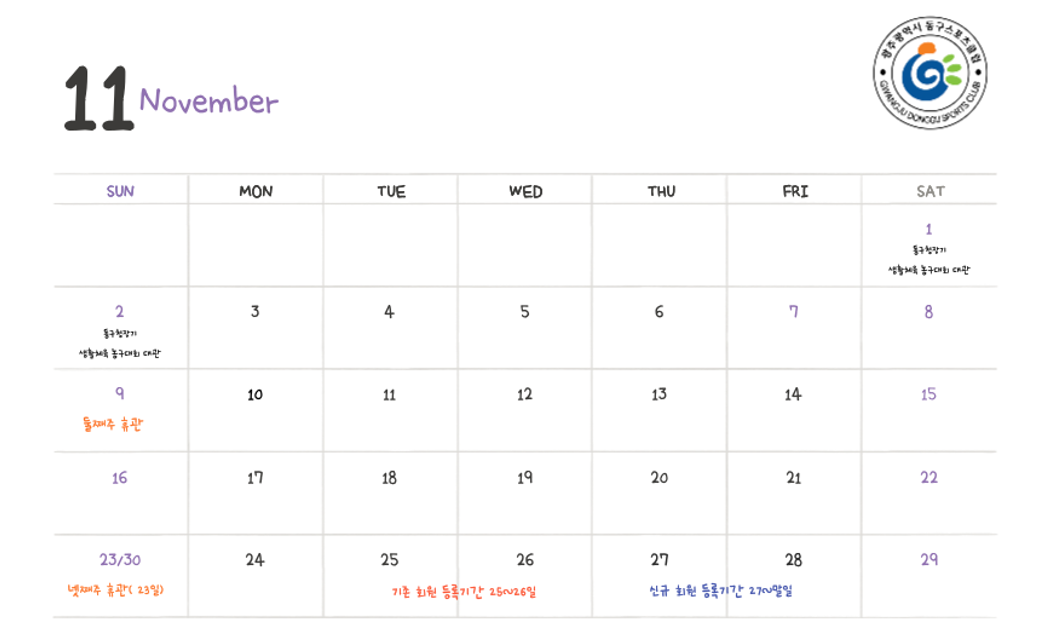 동구스포츠클럽 11월 운영일정 안내드립니다.