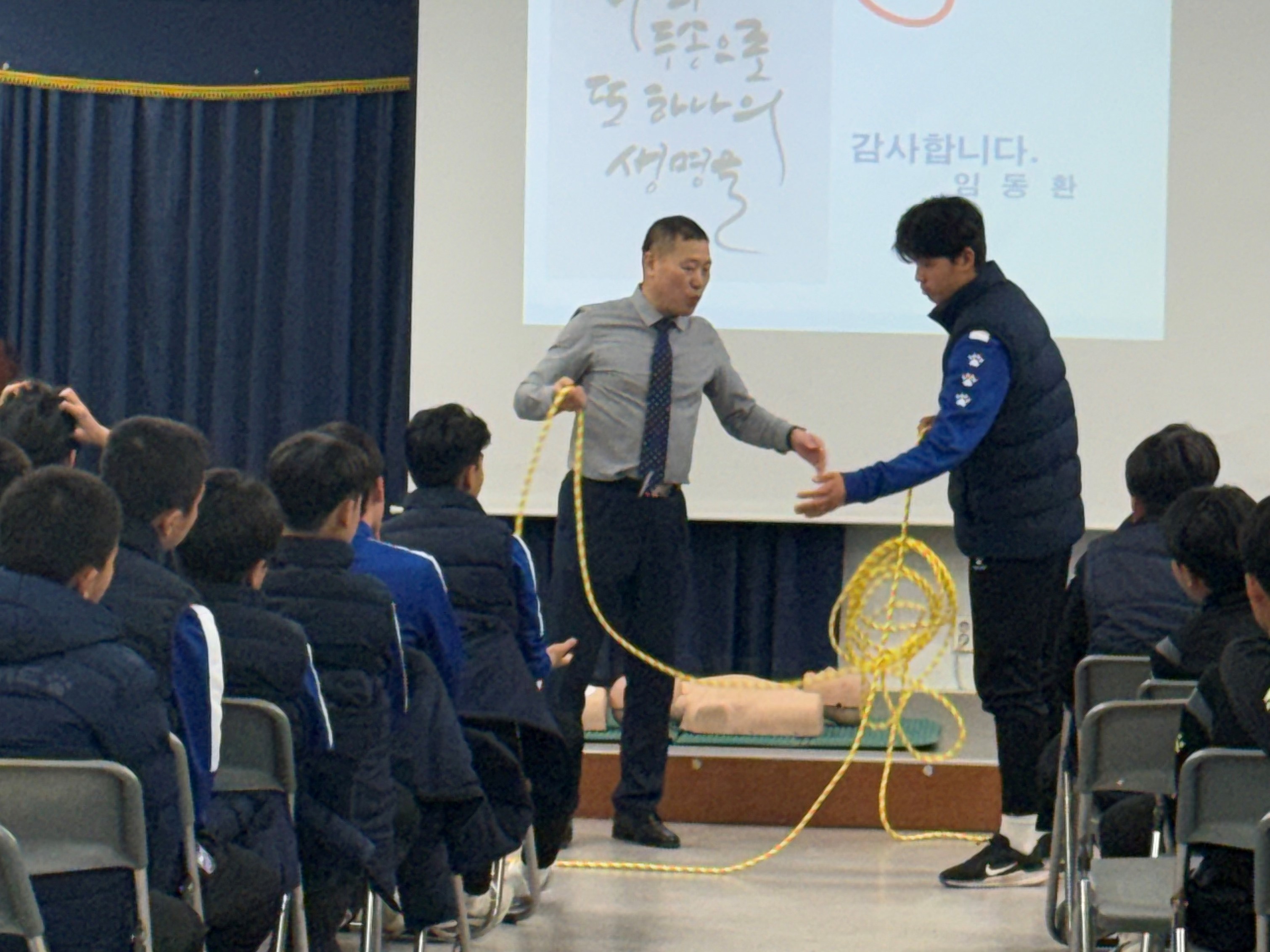 또한 응급상황 대처법을 위한 안전교육을 실시하여 심폐소생술 실습, 하임리히법, 생존 매듭 실습 등을 배우며 위급 상황에서 스스로와 주변을 지킬 수 있는 소중한 지식도 익혔습니다.