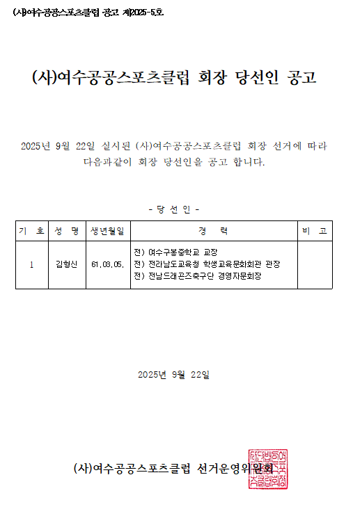 (사)여수공공스포츠클럽 회장 당선인 공고 (제2025-5호)