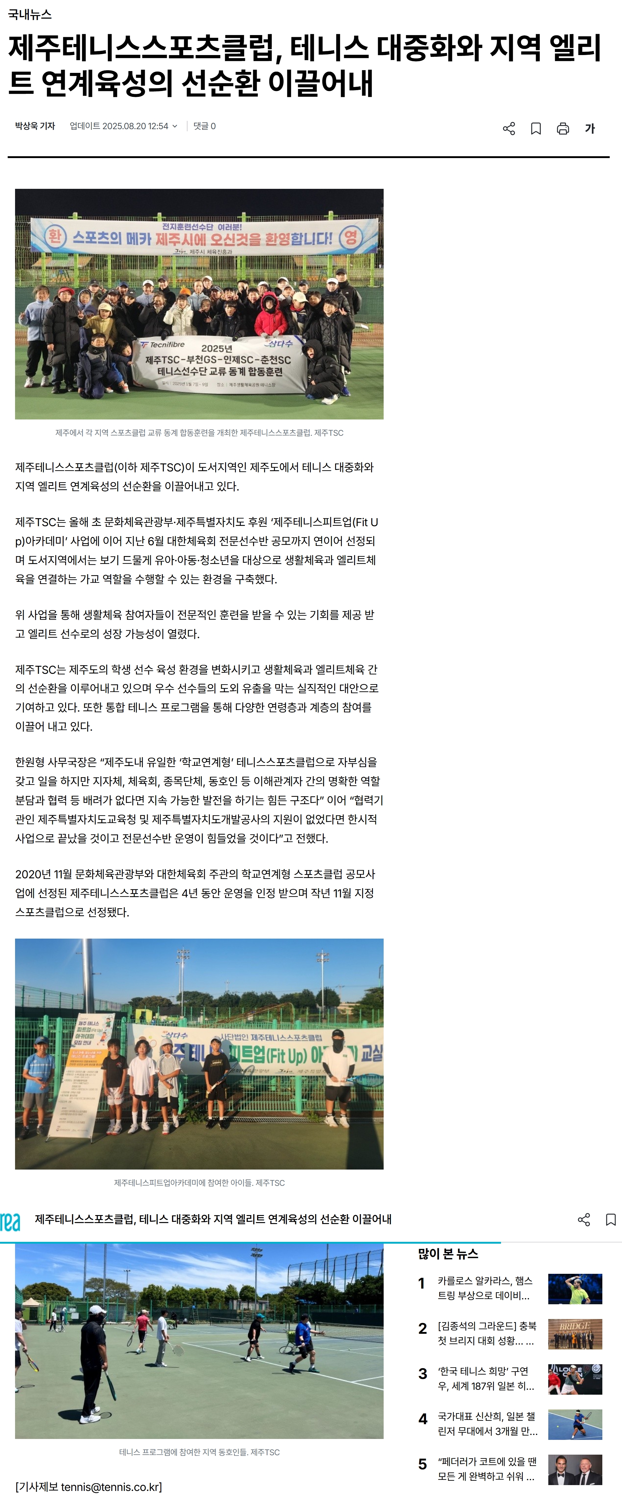 제주테니스스포츠클럽, 테니스 대중화와 지역 엘리트 연계육성의 선순환 이끌어내