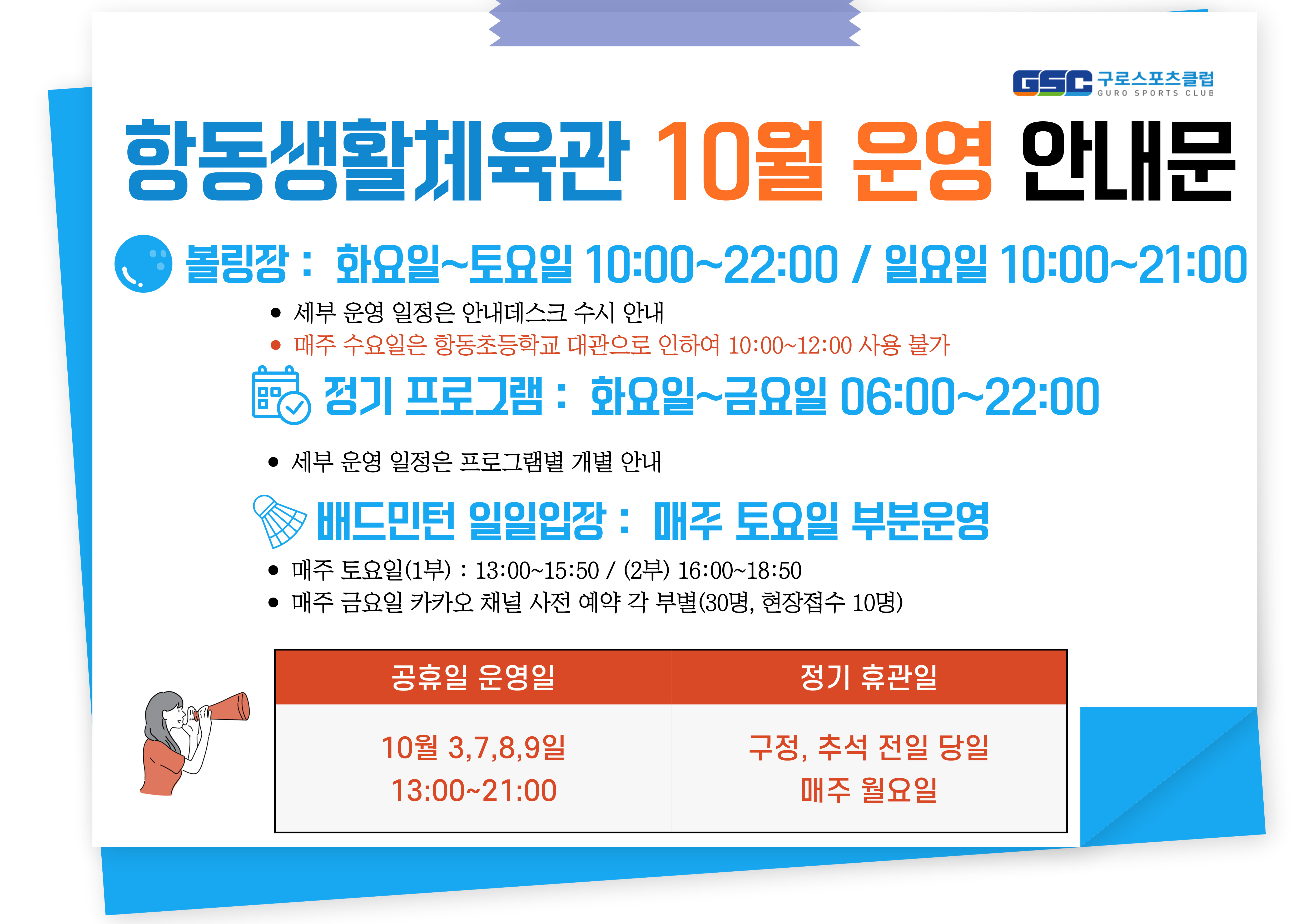 [항동생활체육관] 10월 운영 안내