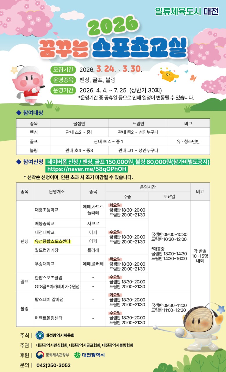 일류체육도시 대전, 2026 꿈꾸는 스포츠교실(상반기) 참가자 모집 네이버 폼 설문에 바로 참여해 보세요. form.naver.com