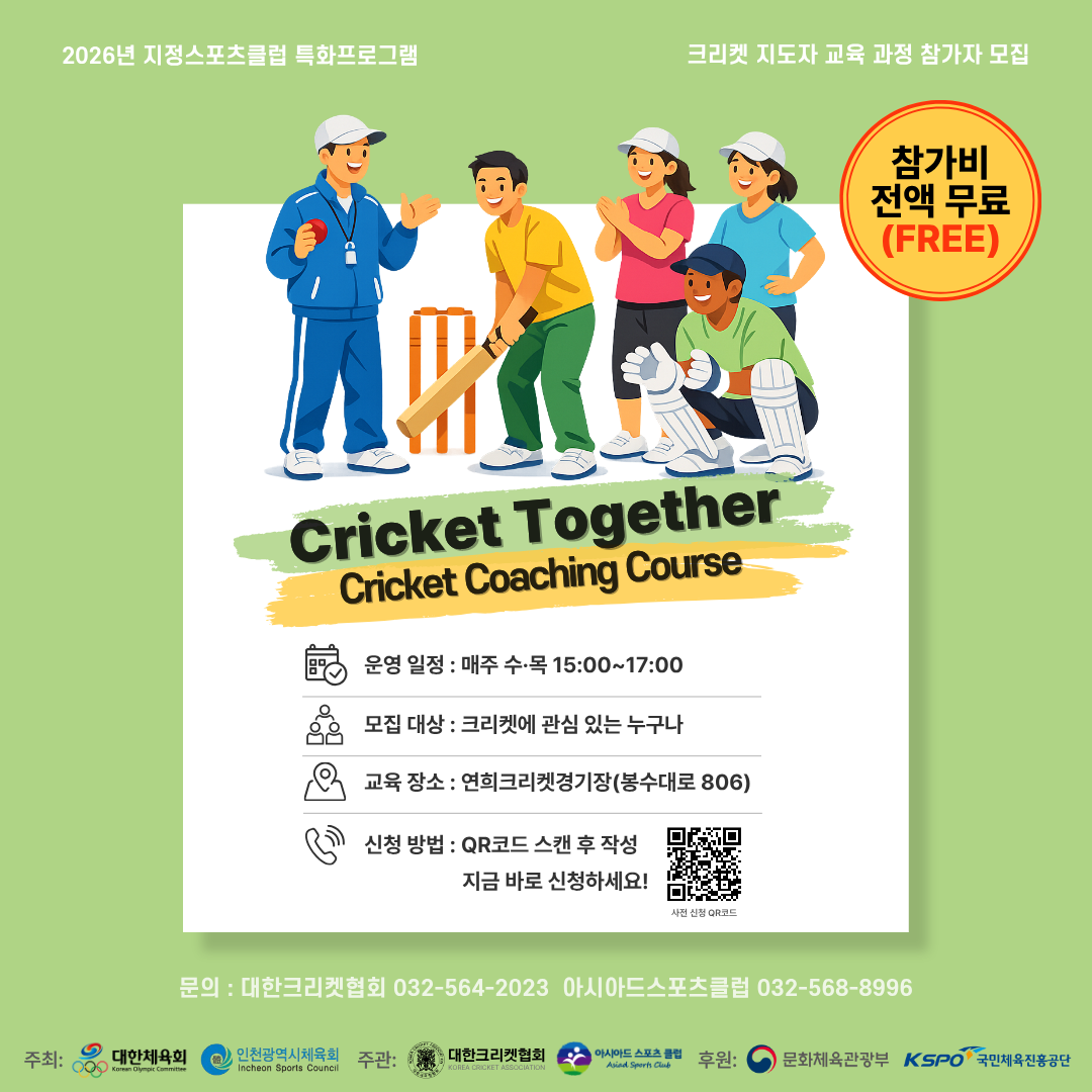 The Korea Cricket Association, in collaboration with Asiad Sports Club, is recruiting participants for the Cricket Together: Cricket Coaching Course, aimed at expanding cricket participation and promoting sports engagement among foreign residents in Korea.