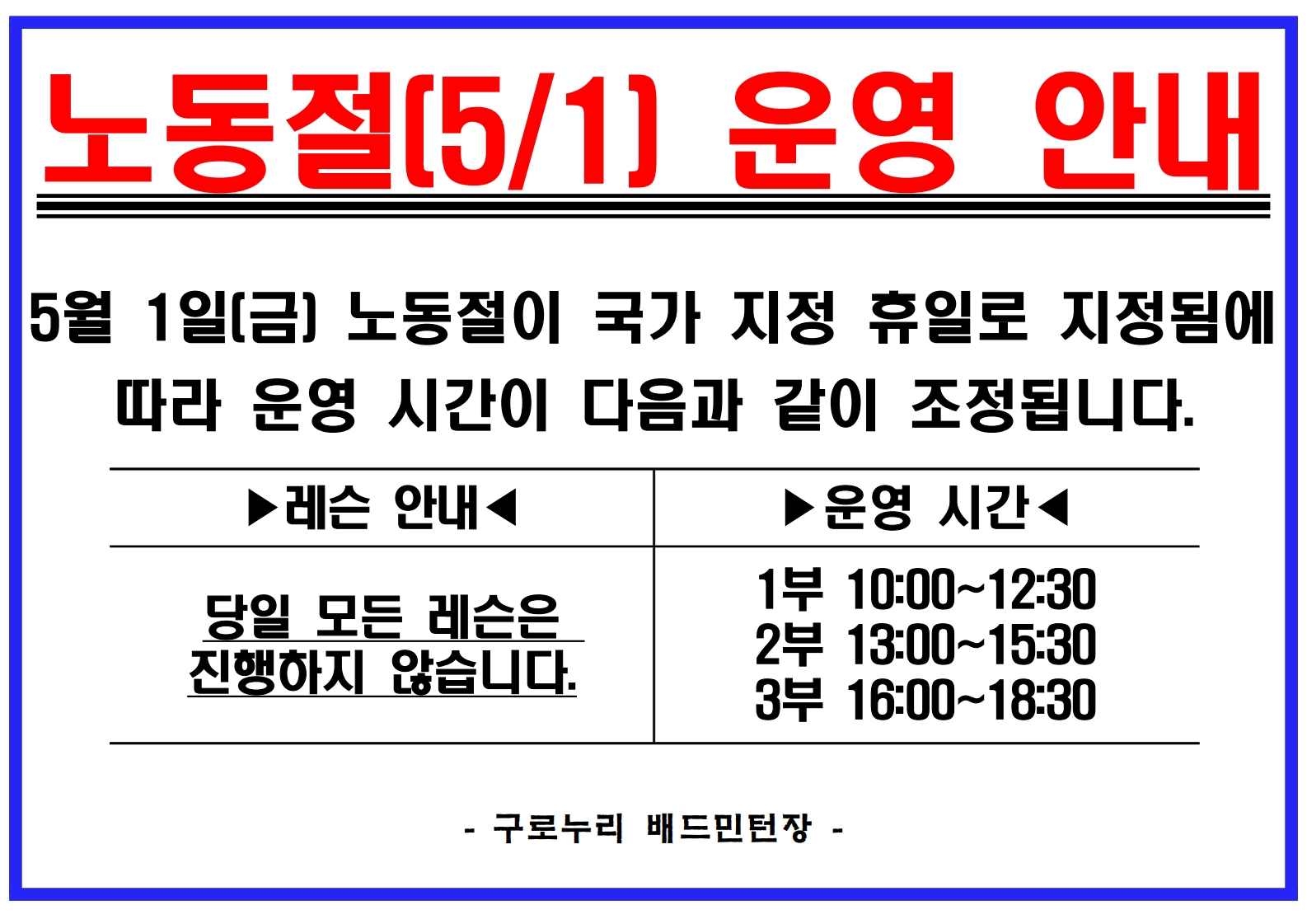 [구로누리배드민턴장] 노동절(5/1) 운영 안내