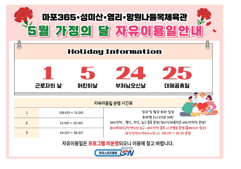 [마포스포츠클럽] 마포365·성미산·염리·망원나들목체육관 5월 가정의 달 자유이용일 안내