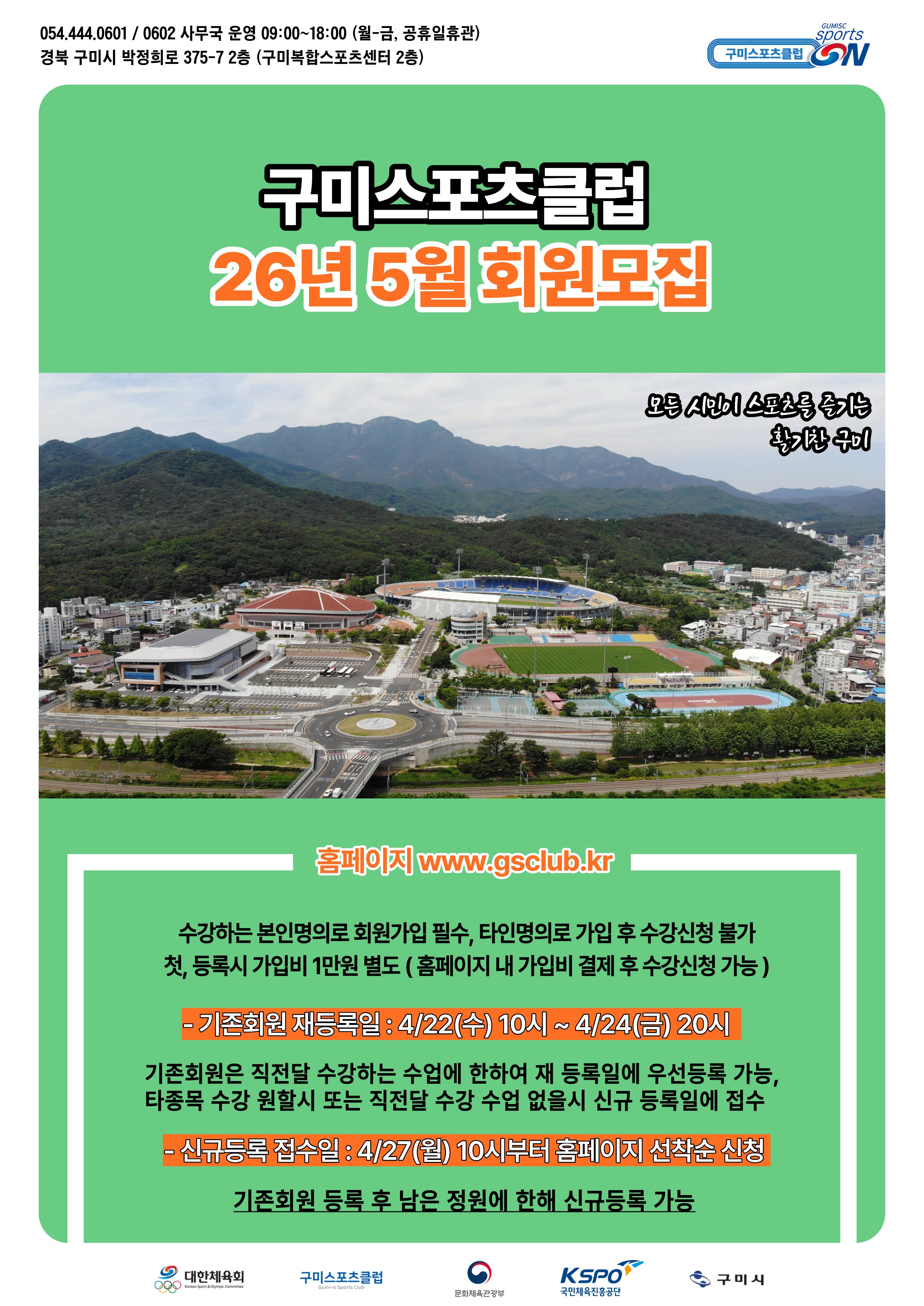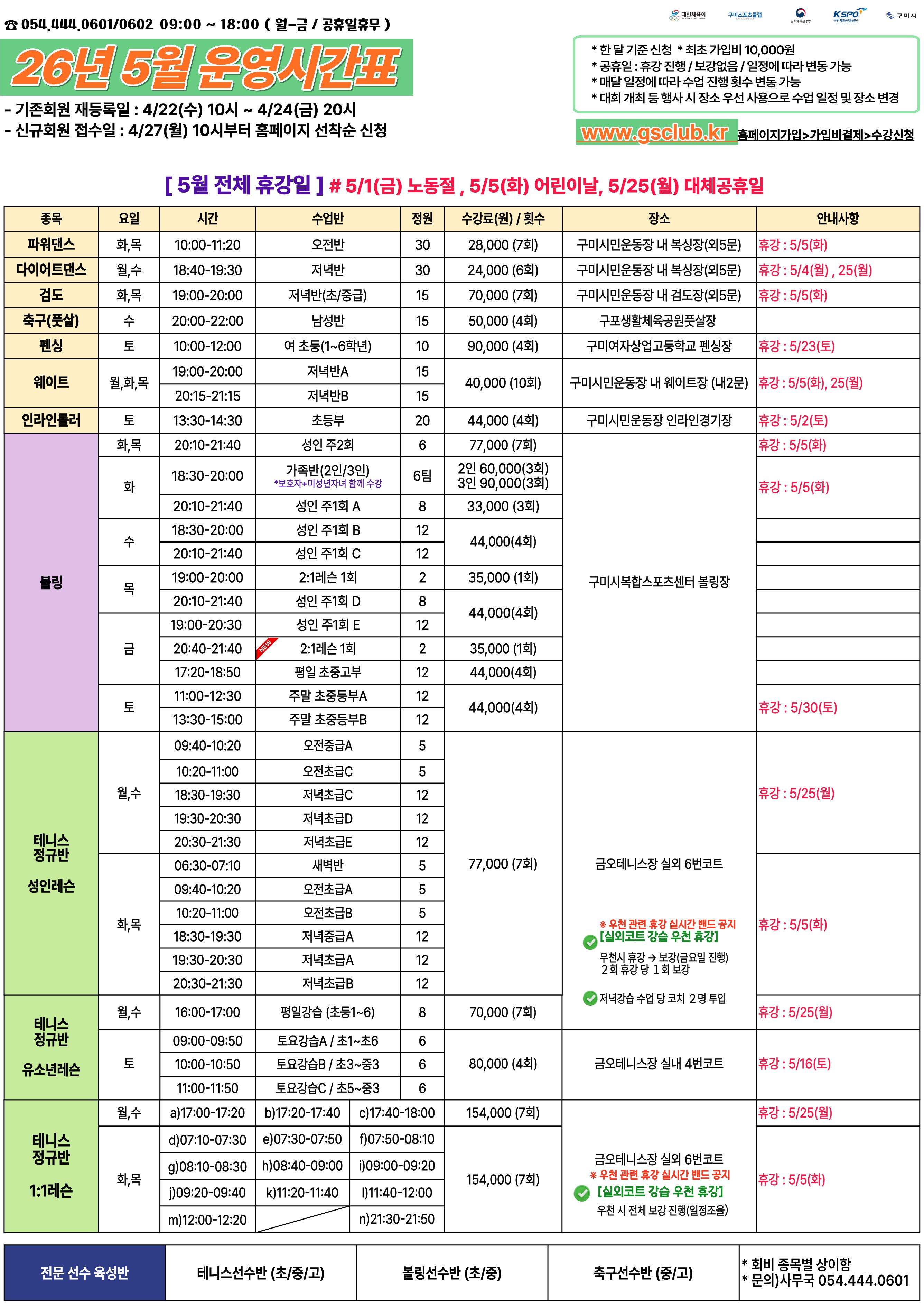 구미스포츠클럽 2026년 5월 운영시간표 안내