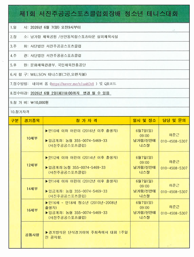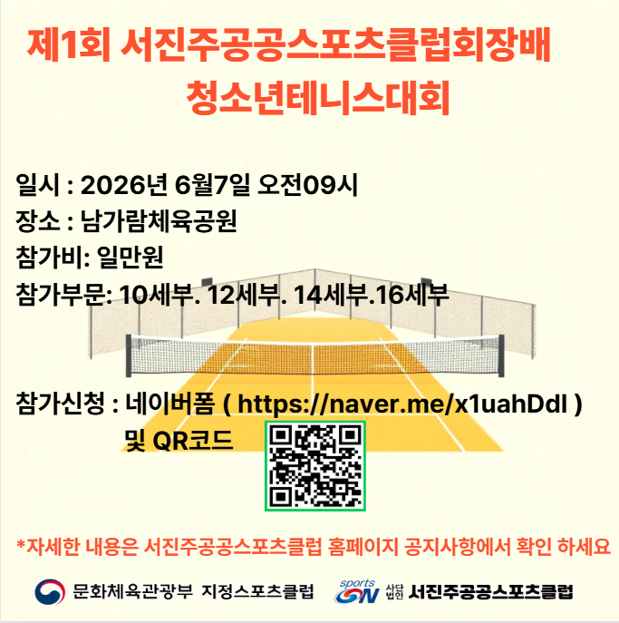 제1회 서진주공공스포츠클럽회장배 청소년테니스대회 참가자 모집